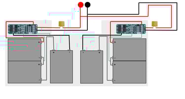 Dos packs de 3 celdas en serie (3S), cada pack con su BMS